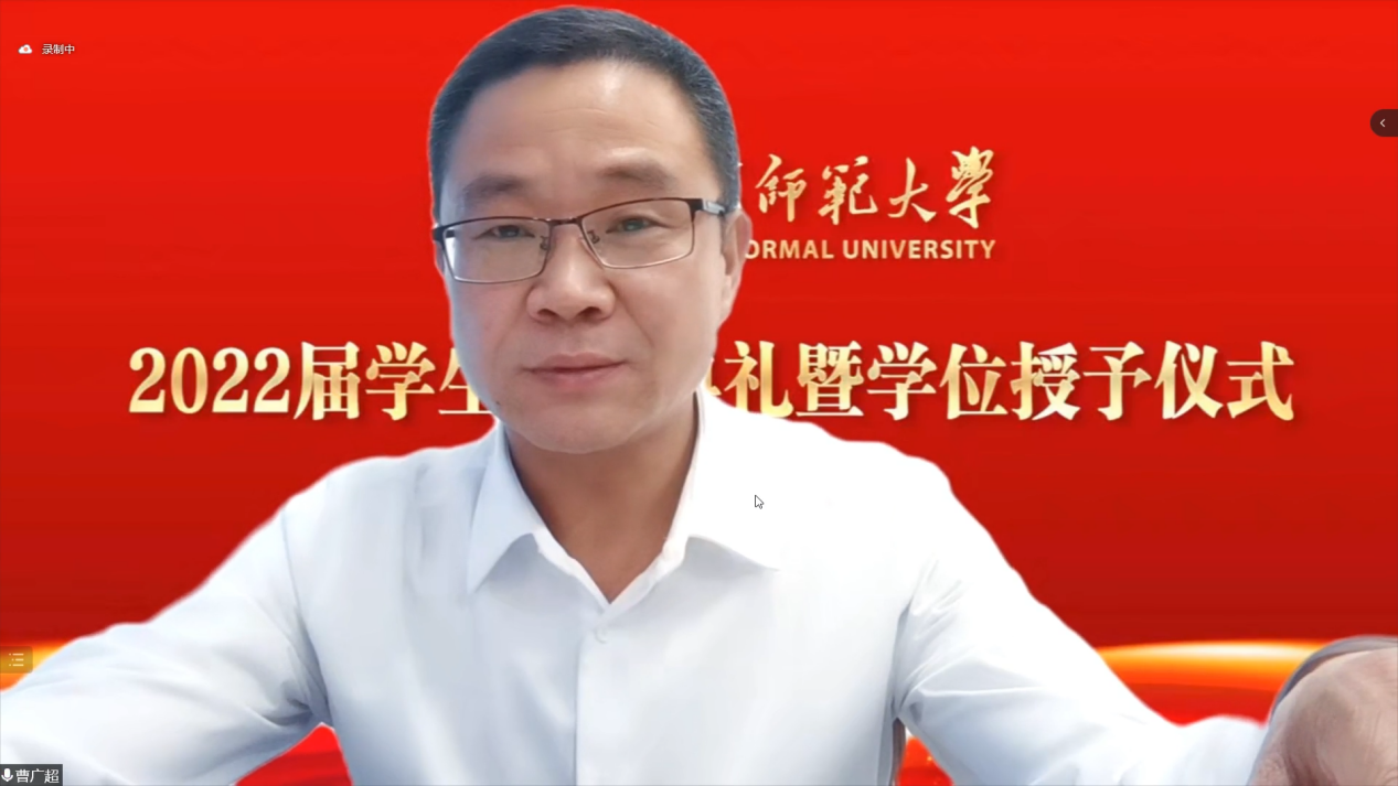 伴随雄壮的国歌声毕业典礼拉开序幕。首先,曹广超副校长代表学校致辞,向2022届全体毕业生表示热烈祝贺,向各位辛勤付出的导师们表示感谢,并提出三点希望:一是希望同学们能够永远保持一颗进取之心,脚踏实地,追求卓越。毕业不是学习的终结,而是新的学习阶段的开始。要不怕艰苦从基层做起,学会从艰难和波折中积累人生阅历。要勇敢地直面现实,积极地投身实践,乐观地迎接挑战。二是希望同学们能够持久拥有一颗豁达之心,热爱生活,宽容自信。能永远敏于感知、拒绝平庸、勇于创新。能兼具人文精神与科学精神,勤于思考、乐于纳言、敢于怀疑、勇于探索。三是希望同学们心系母校、心系家乡、心系祖国。希望同学们经常回母校看看,把成功的喜悦带回来,把社会对母校在教学、科研与管理方面的各种意见和建议带回来,共同促进母校各项事业不断向前发展。