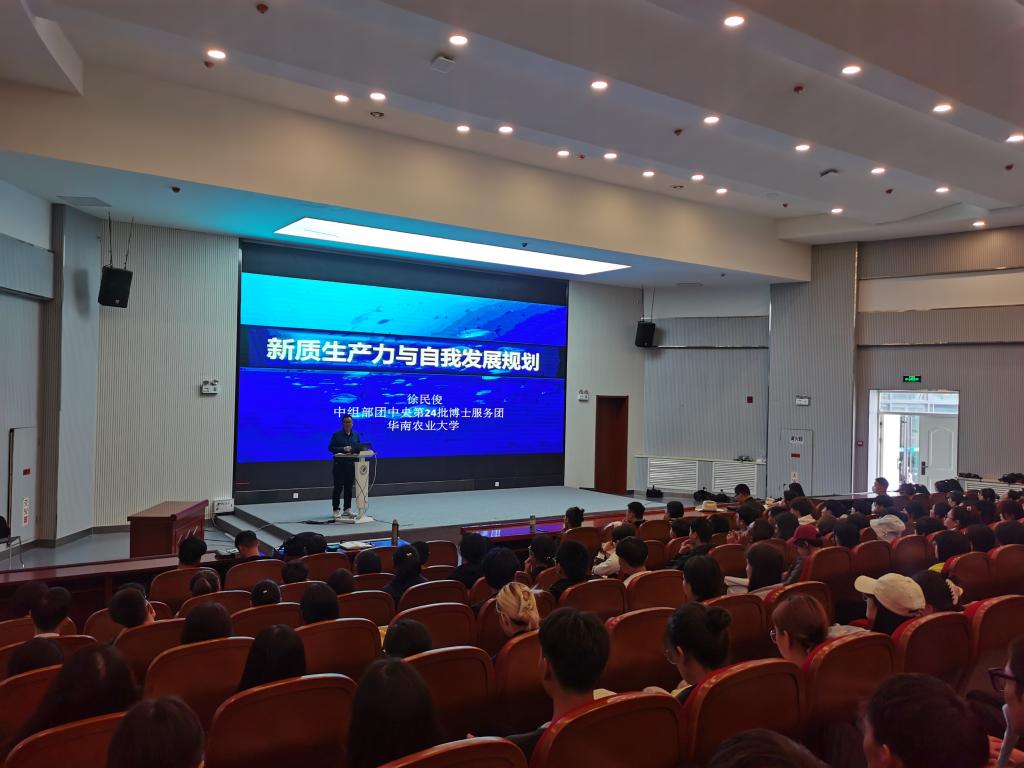 最后,徐民俊副院长做了一场以主题“新质生产力与自我发展规划”的开学第一课,从历史的角度引入对“人类命运共同体”的理解,从解读党的二十大精神了解省情定位和时代任务,从而引出当代大学生自我发展规划的思考。