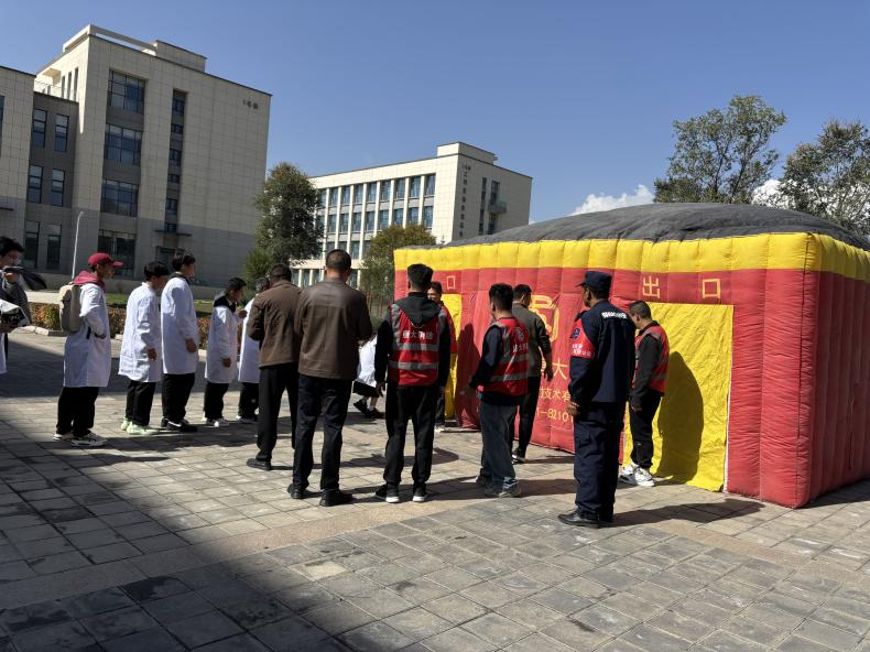 在室外实操阶段,师生在专业人员的指导下轮流操作灭火器,掌握“提、拔、握、压”四字要领,成功扑灭模拟火源。此外,还在帐篷内模拟了火灾浓烟环境,师生们在专业人员的引导下,体验了在视线受阻、空气浑浊条件下的逃生过程。