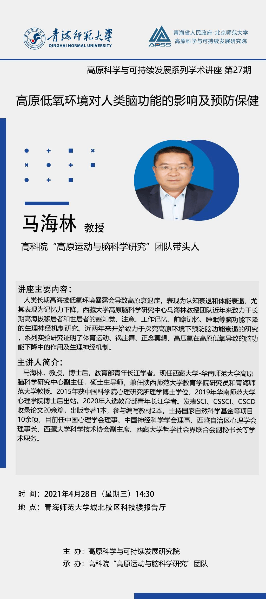 为进一步促进我校高原健康研究、体育教育实践和体育学术交流,定于2021年4月28日(星期三)举办“高原科学与可持续发展系列学术讲座”(第27期)一场。现将有关事项通知如下: