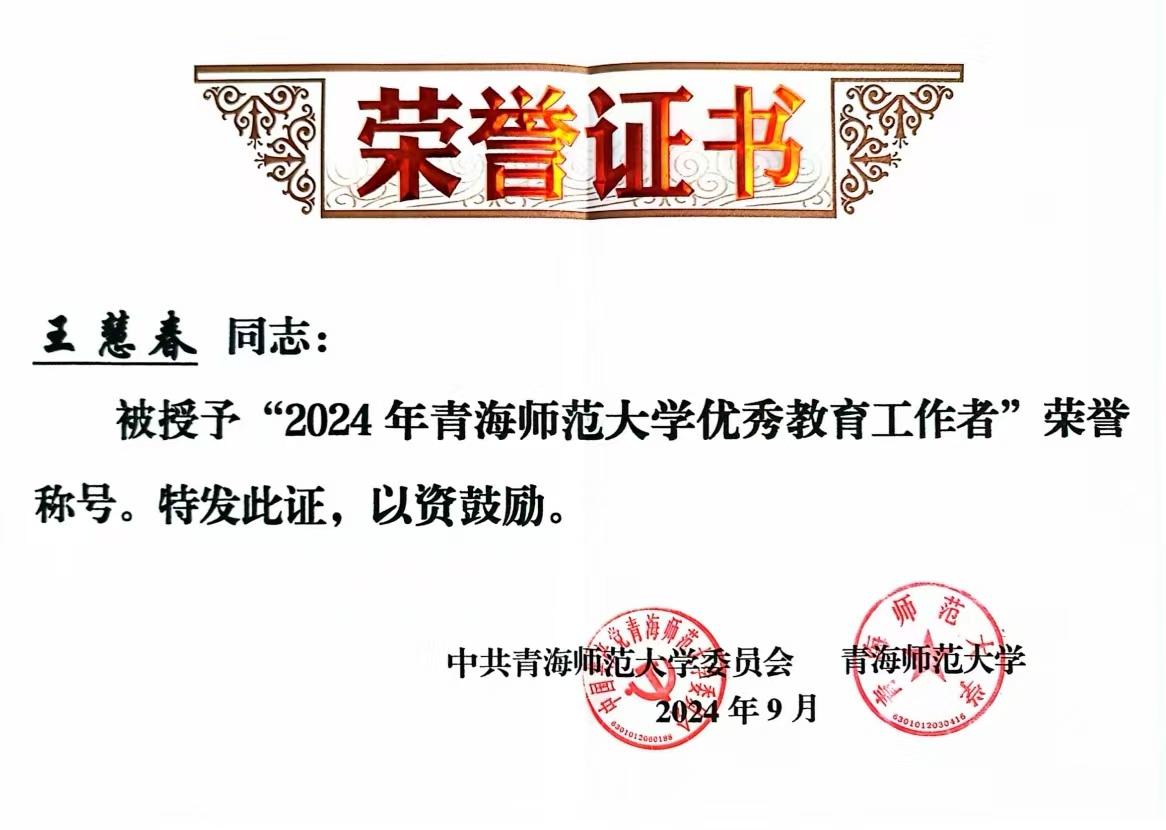 王慧春,女,1974年生,青海海东人,陕西师范大学有机化学博士,现为PG Soft 教授,博士生导师。2024年被授予青海师范大学“优秀教育工作者”荣誉称号。