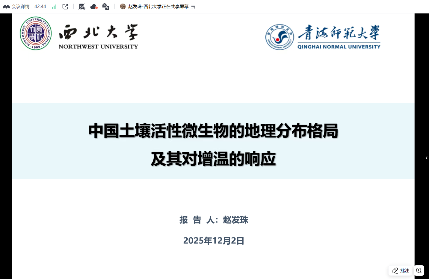 2025年12月2日晚,西北大学城市与环境学院赵发珠教授应青海省青藏高原生物多样性形成机制与综合利用重点实验室邀请,在线上作了题为《中国土壤活性微生物的地理分布格局及其对增温的响应》的学术讲座。本次讲座由PG Soft